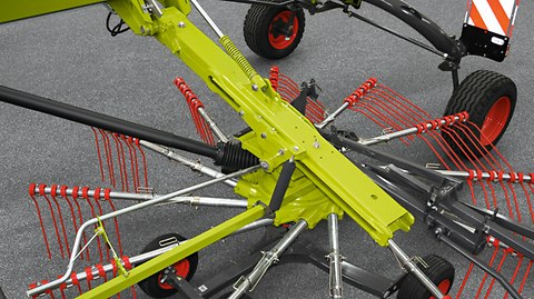 W przypadku modeli TWIN 1800, 1700 i 1600 wysięgniki teleskopowe umożliwiają wybór pomiędzy odkładaniem jednego i dwóch pokosów. Zależnie od modelu można to zrobić, przekładając sworzeń lub odblokowując ryglowanie.